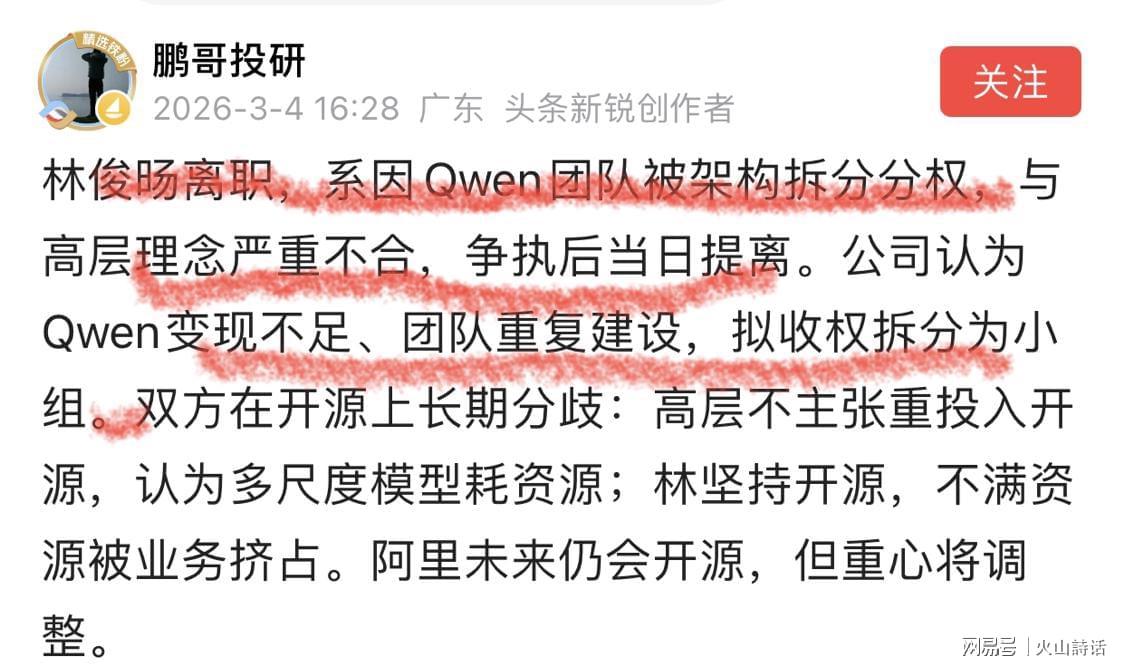 凤凰网科技从多位接近阿里的人士处了解到,这次离开确实很突然,事发在3月3日下午,一场内部会议后,双方产生分歧,林俊旸当场离开。随后在几小时后,其个人在X平台官方宣布了这一消息。